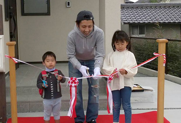 合志総合住宅展示場アドバイザーの江口です。 先日、見学会でもお世話になった、K様邸のお引渡し式に参加しました。 私たちアドバイザーは通常展示場でお会いするだけということが多く、お客様のお引渡し式に参加することはほとんどありません。今回は、サプライズで参加させていただきました。 K様との出会いは4年ほど前。まだ県外にお住まいで、熊本に里帰りされた時に、以前あった光の森の展示場でお会いしたのが始まりでした。そのとき、「木の家の気持ちよさ」をとても気に入っていただいたのを覚えています。 その後、2年前に熊本に住まいを移され、その夏にKKT合志総合住宅展示場で再びお会いしました。県外にお住まいの間も「インスタグラムで新産住拓のすまいを見ていましたよ」とうれしいお話が聴けました。 引き渡し当日は2人のお子様、さーちゃんとさっくんもテープカット。 【写真1:テープカット】 【写真2:カギ】 初めての鍵開けにニコニコ顔で参加され、さっそく自分たちの部屋の案内をしてくれました。さーちゃんがピンク、さっくんがグレーのカーテンを得意げに見せてくれました(^^) 子ども部屋は、将来分けることができるようになっており、いずれ部屋を分けるときに工事が要らないよう、はめ込み式のパーテーションが採用されていました。(パーテーションもすでに準備され、押し入れの中にしまってありました。)設計の橋口の提案とのことでしたが、いいアイディアだと思いました。 この日は私達より先に訪問者(小さなクモさん)があり、さっくんが手厚いおもてなしをしていました。クモさんもビックリだったでしょう。 【写真3:クモさん】 K様は、ご夫婦とも光の森の“TJ天気予報”という美容室で働かれています。そのセンスの良さで、このお家を少しずつ“オンリーワンのお住まい”に造り上げていかれることでしょう。 K様、ご新居の完成おめでとうございます。これからもこのご縁を大切に繋げていただけたらと思っています。 KKT合志総合住宅展示場 江口