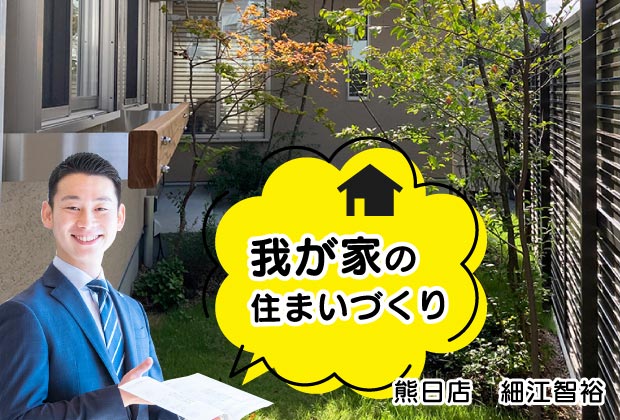 KAB総合住宅浜線展示場の細江です。 前回の投稿から1年半が経ちました。 久しぶりに、我が家の暮らしを投稿したいと思います。 1.緑のある暮らし家を建てることが決まってから、建築に関わるさまざまな本を読みました。 「窓越しに緑が見える家、植栽がある家」はカッコいいと思い、外構を担当してくれた社員に相談しました。 道路側には建物が映えるように、高さの異なる木を植えてもらい、庭石や下草が季節ごとに表情を変えてくれます。 木や花については詳しくないですが、いろいろな色の実や花が楽しめ、家族の会話の1つになっていて楽しいです。 庭側は、自然に植えてあるような雰囲気を出すため、あえて建物に近づけて木を植えてもらいました。また、外からの視線が気になる場所には、年中葉がついている常緑樹を植えてもらっています。 そして、念願だった紅葉も植えてもらいました。昨年は暖かかったため紅葉の見頃は年末ごろでしたが、自宅で季節を感じることができる私の楽しみの1つです。 2.ウッドデッキのある暮らし東側には、6帖+縁側のようなウッドデッキがあります。 私の実家はウッドデッキでBBQをよくする家庭だったので、憧れていました。 東側に設置した理由は、夏の暑い夕日を遮ってBBQをしたかったからです。 結果的に、子どもとプール遊びをする際も、夕方は直射日光が当たらないので快適に楽しめています。 年末には、初めてウッドデッキの塗装をしました。 色の抜けを感じていたので、木の保護を目的に“塗膜を貼るイメージ”で、素人ながらやってみました。 塗料は某ホームセンターで購入しました。 意外に簡単で楽しかったので、ぜひ皆さんも挑戦してみてください。(※壁や窓周りに塗料が付着しないように、マスキングテープがあると便利です。) ちなみに、新産住拓では、雨風で外部の木材が傷まないように「加圧注入」をした材料を採用しています。 この技術は、大分県の木造ジェットコースターにも使用されており、耐久性が非常に高いのが特長です。また、赤ちゃんが触れても安心・安全な素材なので、ご家族全員が安心して使えるのも魅力です。 せっかくのウッドデッキも、防腐処理ができていなければ数年しか持ちません。 長い期間、木の家の暮らしを楽しんで頂けるように、「加圧注入」の家づくりを検討してみてください。(※防蟻対策も重要です。) 3.ハンモックのある暮らし初めは予定していませんでしたが、妻の実家にあるハンモックに憧れて自家製で作ってみました。 材料は某ホームセンターで揃え、材料費は数千円でした。 リビングに化粧梁があったので、そこにロープを引っ掛けて設置したところ、娘がすっかり気に入り、今では娘の居場所になっています。設置して1年以上が経ちますが、今でもソファー代わりに使ってくれています。 木の家の良いところは、DIYができることでもあると思います。 得意な方、ご興味ある方はぜひされてみてください。楽しいアイテムですよ! 以上3点、築3年の木の家の暮らしについてご紹介しました。 私のInstagramでも日常を公開していますので、木の暮らしの参考になると思います。よろしければ、お気軽にフォローいただけるとうれしいです!▼Instagramはこちらからhttps://www.instagram.com/hosoe.shinsan/▼我が家の住まいづくりについてはこちらhttps://sumai.shinsan.com/blog/?staff=13 KAB総合住宅浜線展示場 細江 智裕