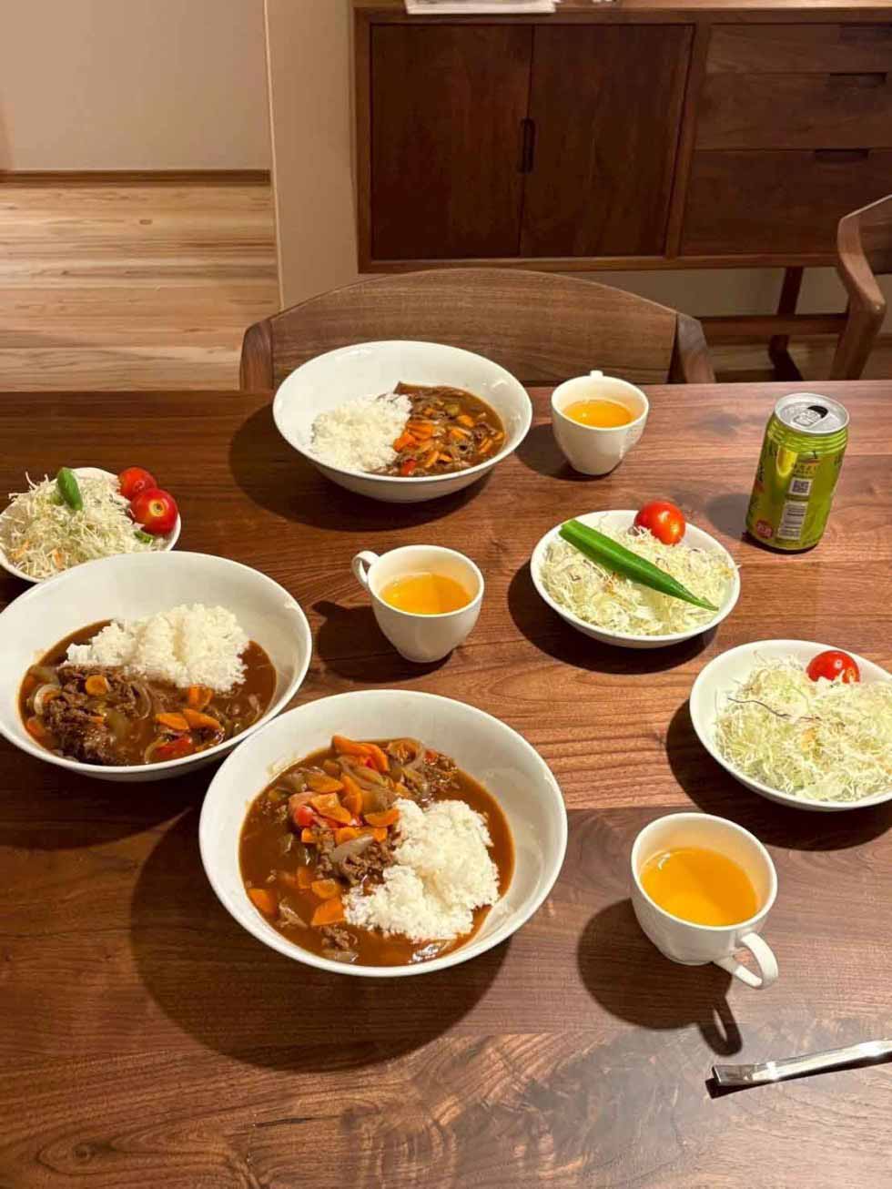 夕ご飯にハヤシライスを作ったのですが、キッチンは3人で並んでも広々としていて調理がしやすく、 配膳も隣のテーブルにすぐ運べるので片付けもラクでした。