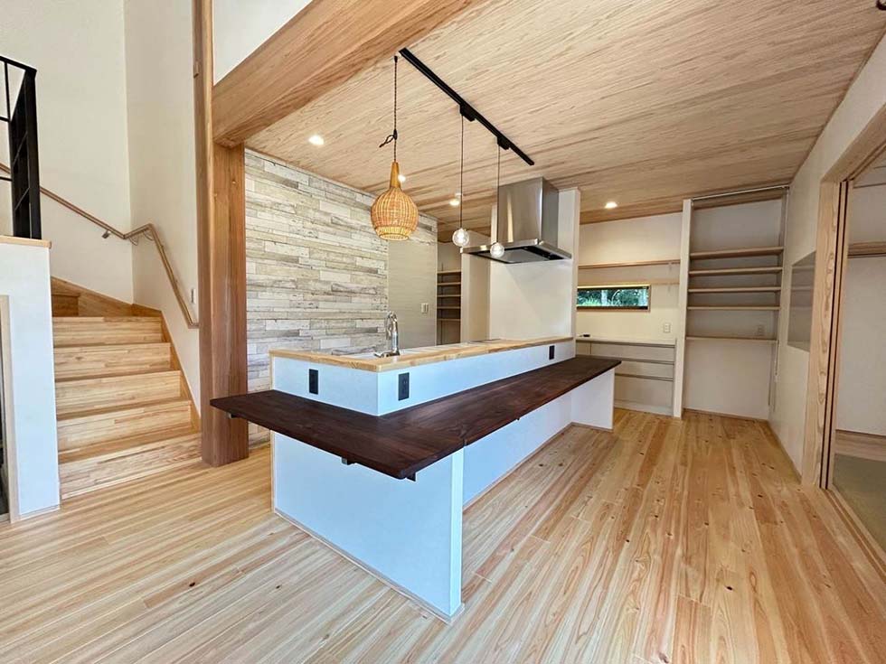 こちらは、ウォールナット材を使用したキッチンカウンターが特徴の空間。