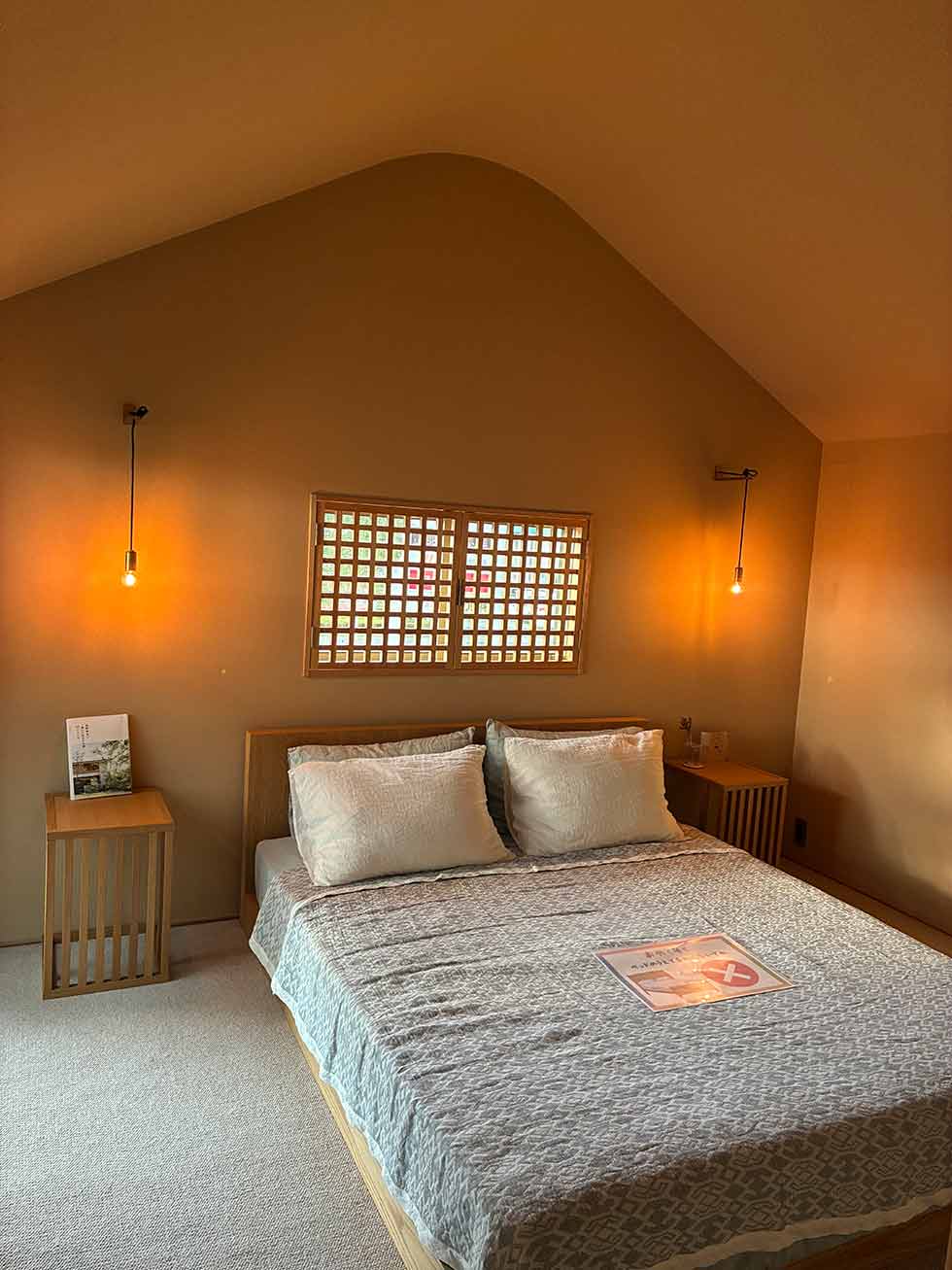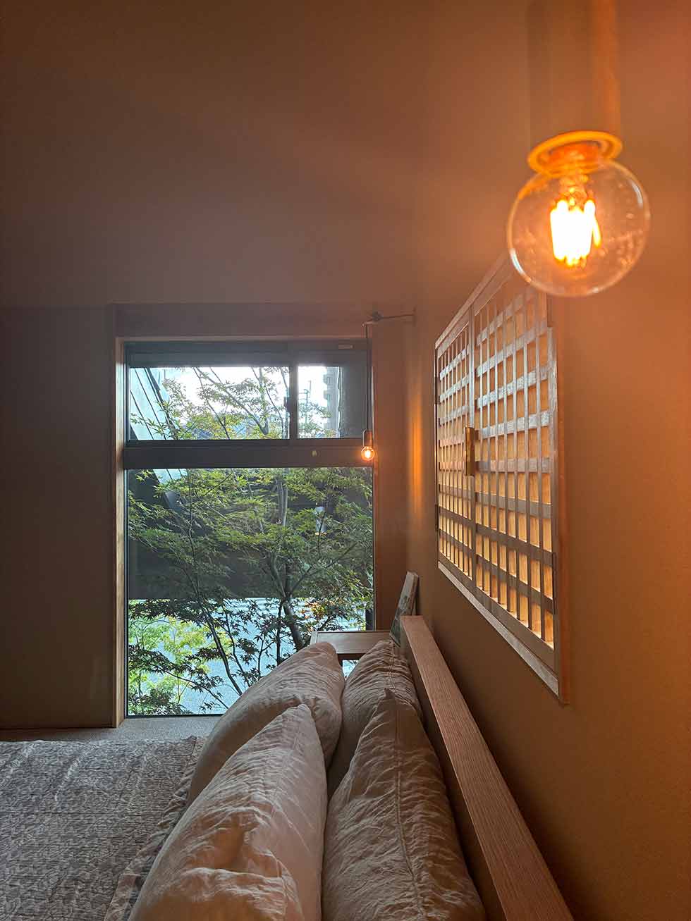 朝は窓からやわらかい木漏れ日が差し込み、夜は壁に設けた照明があたたかな光で空間を包み込みます。