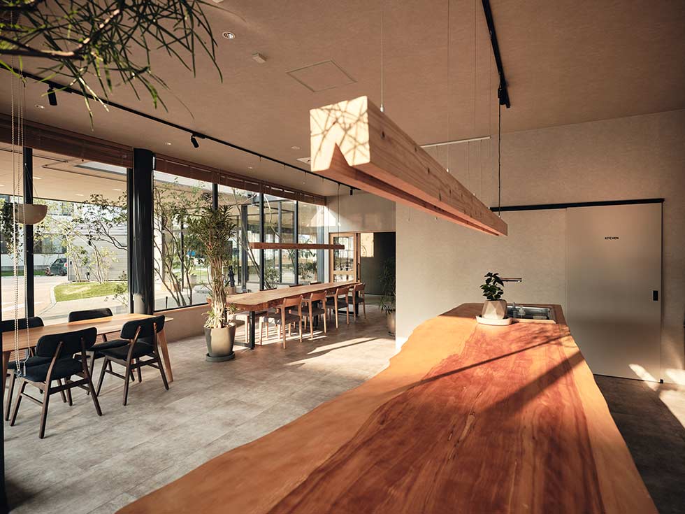 まず、このカフェの象徴ともいえるのが、大きな一枚板のテーブルです。