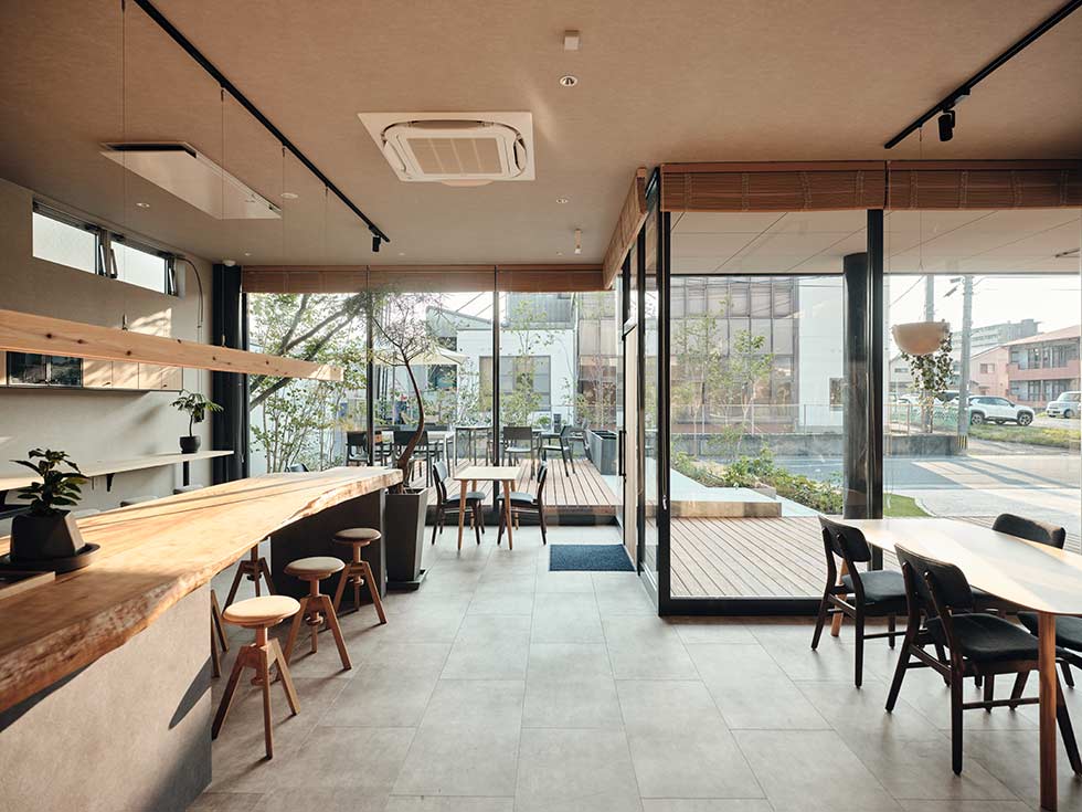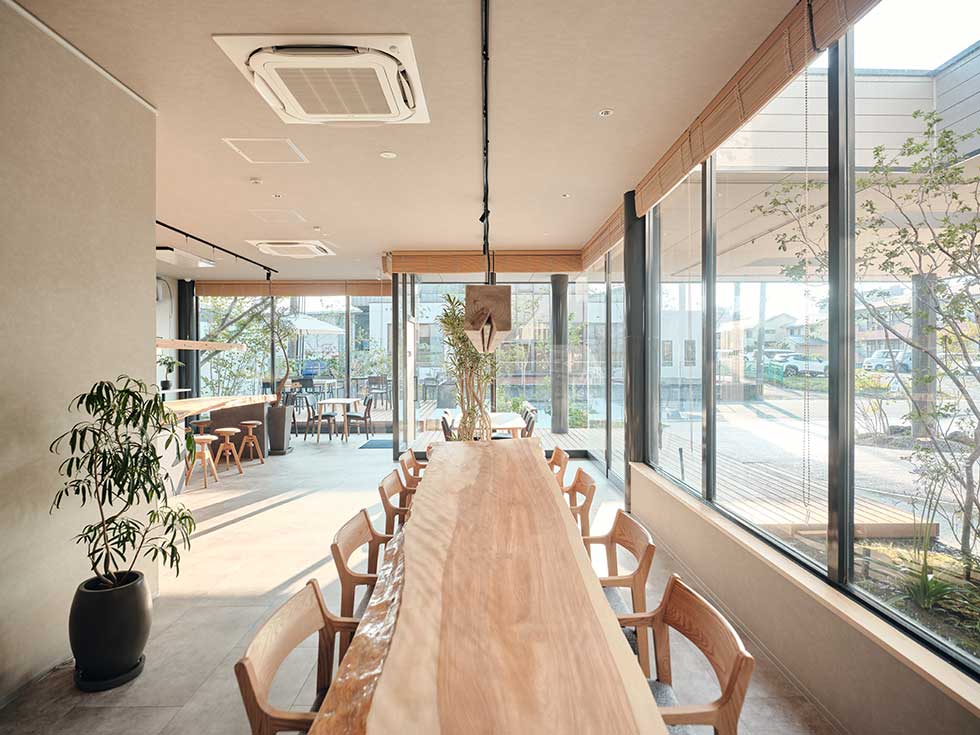 次に、cafeは大きなガラス窓に囲まれていて、外の植栽やウッドデッキの景色がやさしく視界に入ってきます。