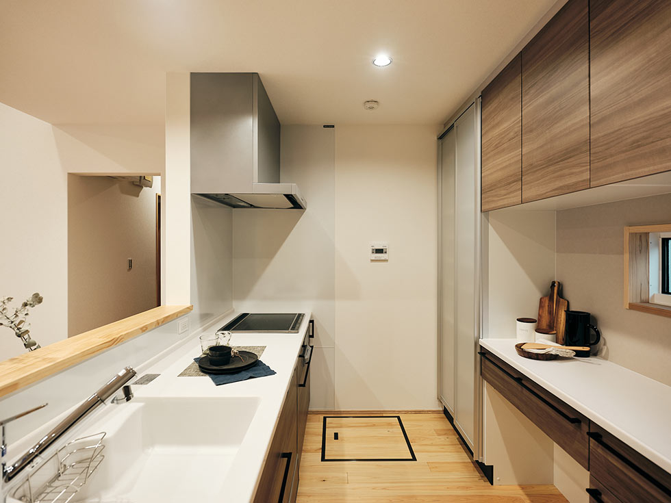 キッチン背面には、たっぷり収納できるカップボードを設けているので、食器・調理家電・食品ストックなどをまとめて、しまっておけます。