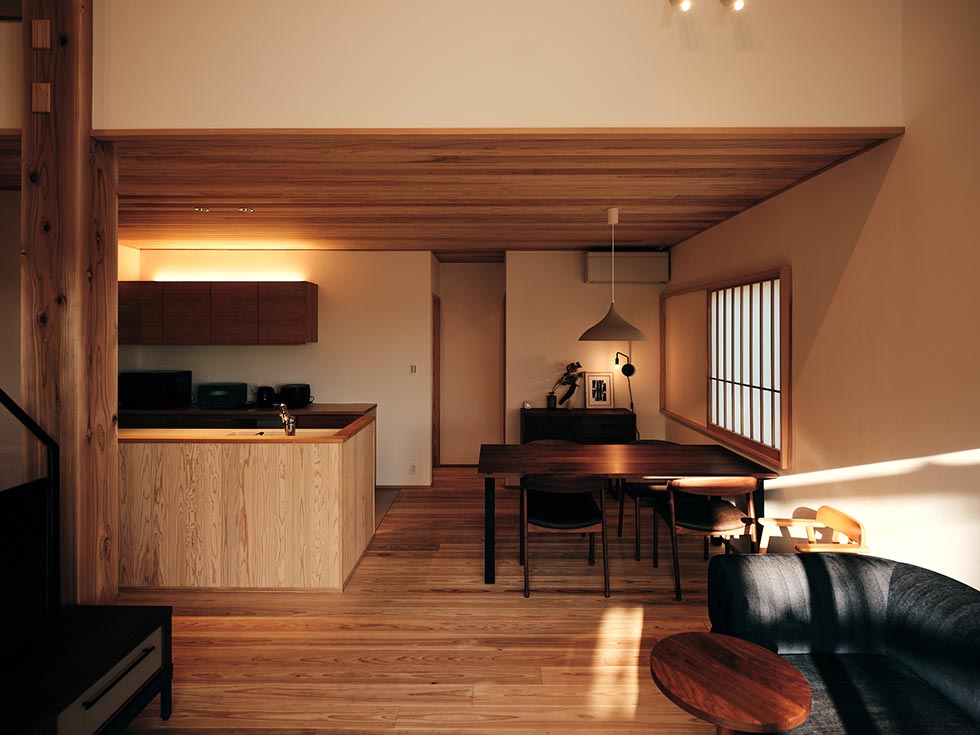 家の中心となるLDKには、節の少ない杉材を天井や床に採用。