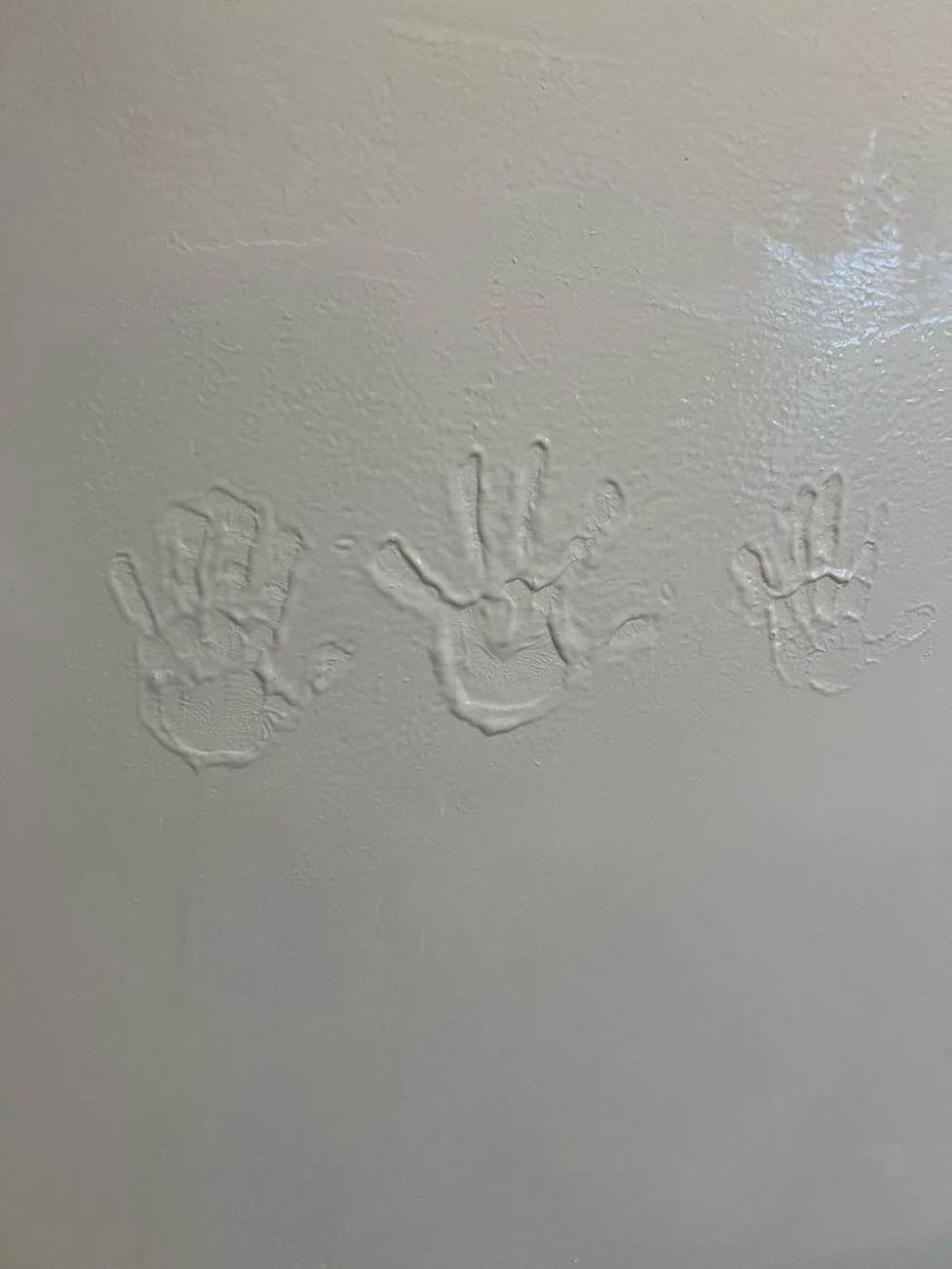建物が着工して完成間近になった際には、K様のこだわりで漆喰の壁に、ご家族様の素敵な思い出として手形を残されました。