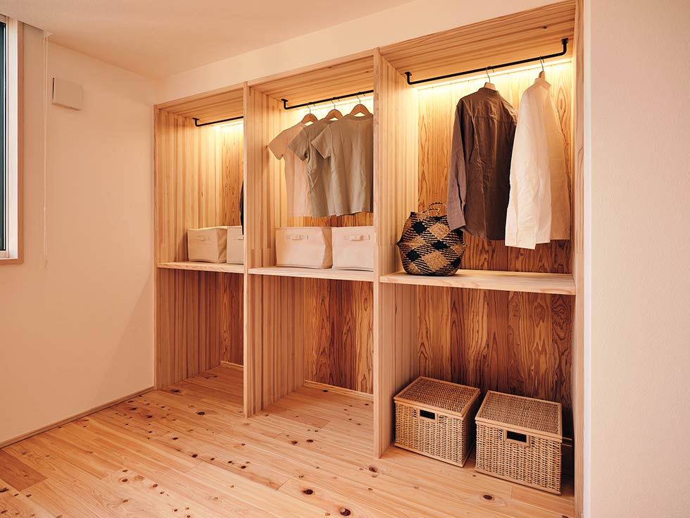LDKだけでなく2Fの主寝室にも杉材をたっぷり使っているので、1日頑張った体を木の温もりが優しく体を労わるように感じられ、さらに木の香りに包み込まれる、上質な癒しの空間になっています。