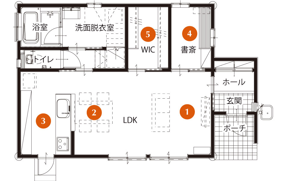 1FにWICを設けることで、身支度がすべて1Fで完結。洗濯物を干して、そのまま収納できる便利な家事ラク動線が魅力です。