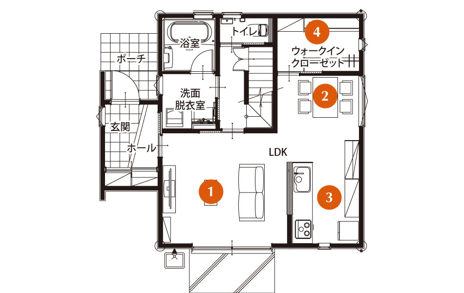 1Fにクローゼットを設けているため、外で干した洗濯物をそのまま収納できる家事ラク動線を実現。朝の身支度も1階で完結できるのもうれしいポイントです。