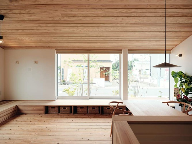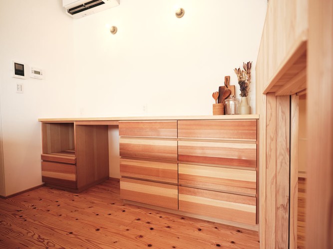 天井には杉材、床には杉の浮造り仕上げを採用しており、新産住拓らしい木質感と自然素材がたっぷり感じられる、心地よい住まいとなりました。