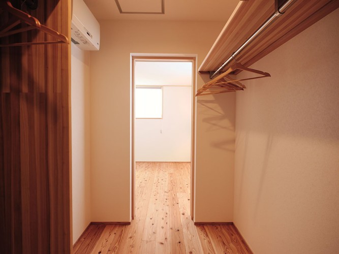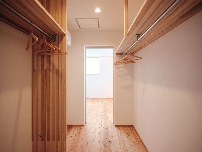 主寝室からはウォークインクローゼットを通り、洗面台などの水まわりへ一直線につながる家事ラク動線の間取り。家事はもちろん、朝の身支度にも便利です。