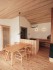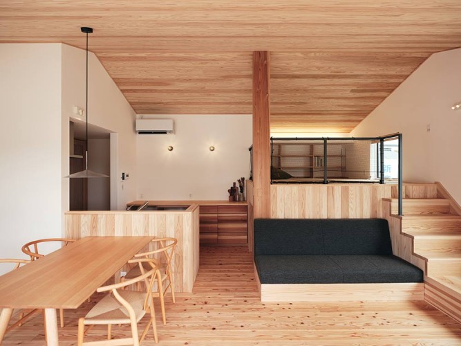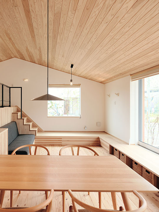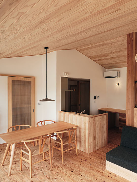 杉板天井の温かみが感じられるLDKは、勾配天井を採用することで開放的な空間になっています。
