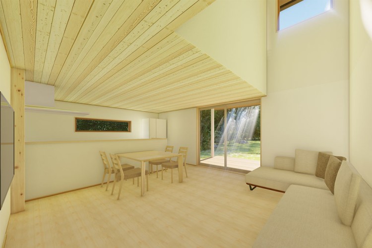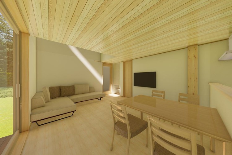 杉板天井で温かみのあるLDKは、木の香りに包まれた心地よい空間。