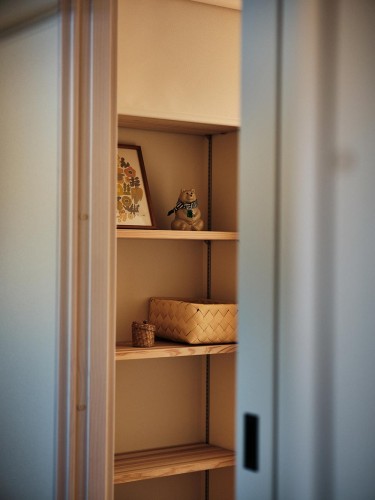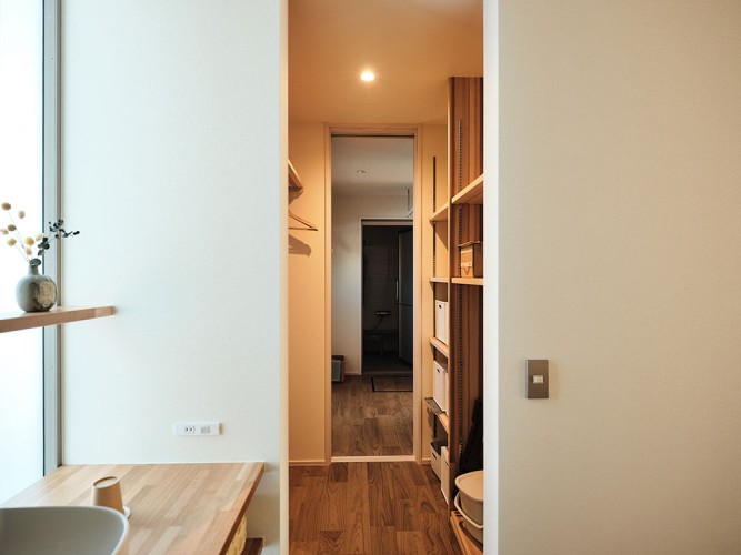 電子レンジや冷蔵庫などの家電も一緒に収納できるパントリー。造作収納もあるので、食器なども収納が可能です。