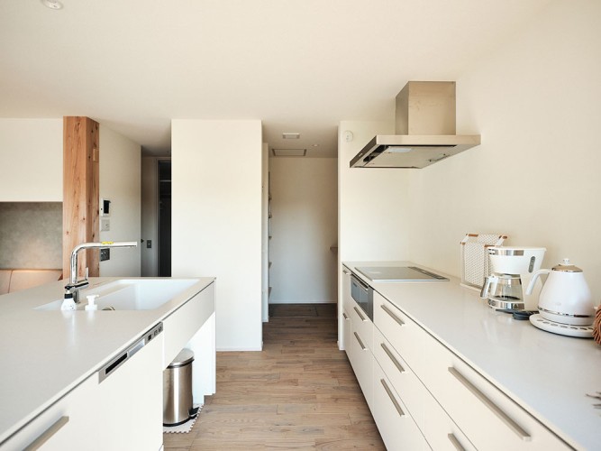 床材にはクリを採用し、全体的にホワイトとグレーを基調としたシンプルなデザインに仕上げています。