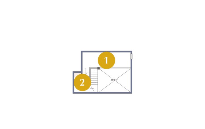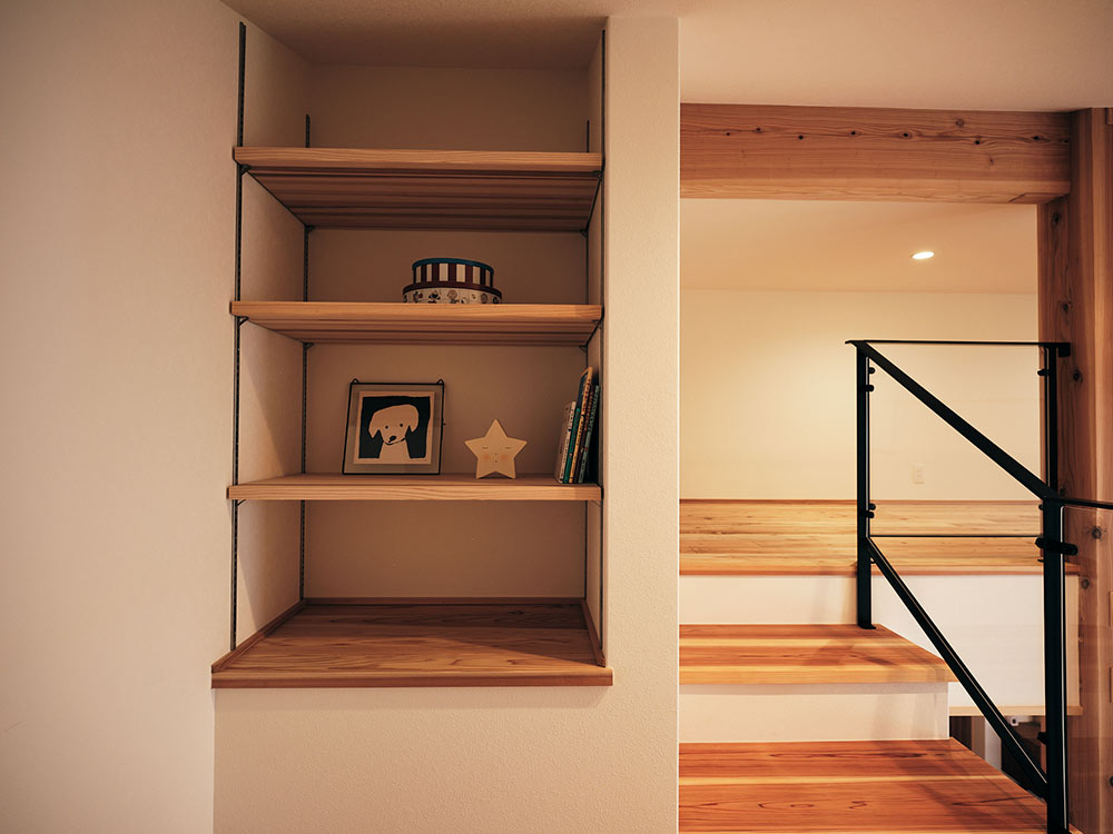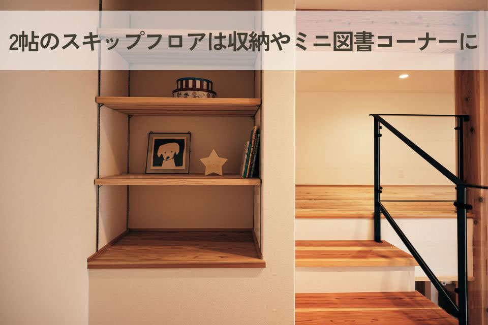 階段の途中に2帖のスキップフロア(踊り場)を設けて、収納スペースを確保。本などを置けば、ちょっとしたライブラリーコーナーとしても活用できます。