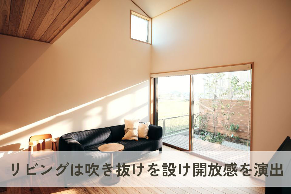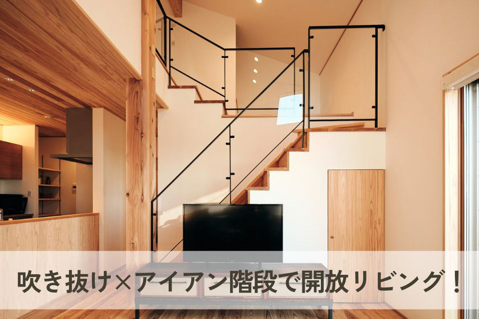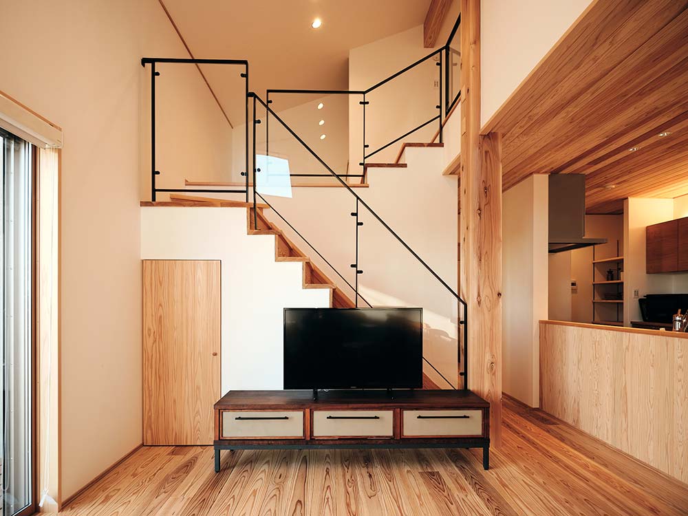 リビングの上部に吹き抜けを設け、開放感あふれる空間に仕上げました。階段に採用したアイアンの手すりがインテリアのアクセントに。階段下を活用した収納も便利です。