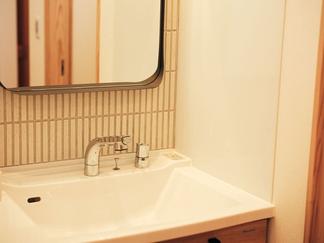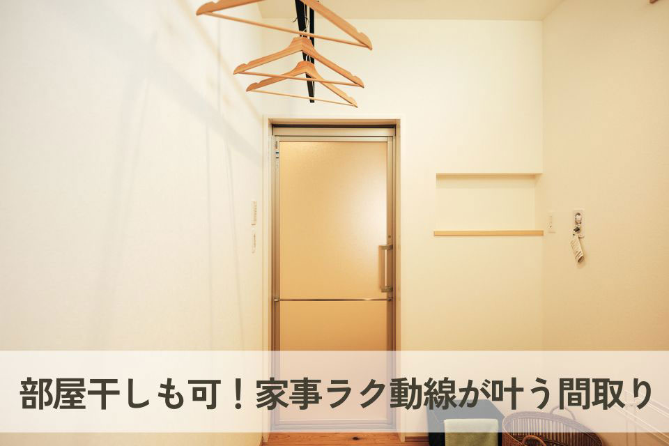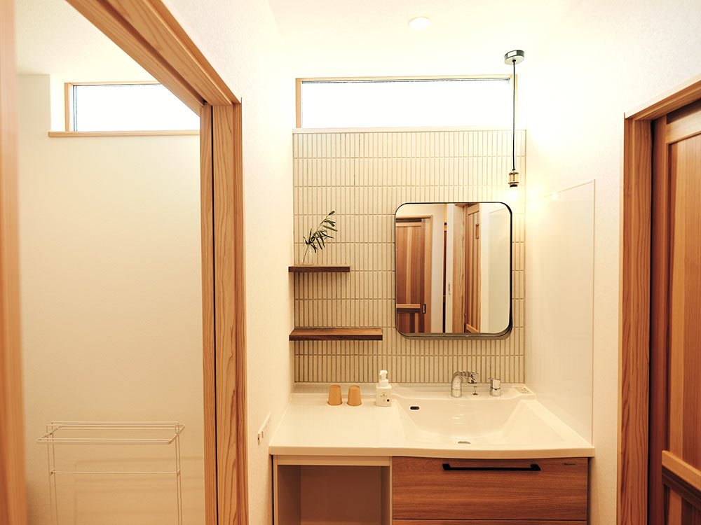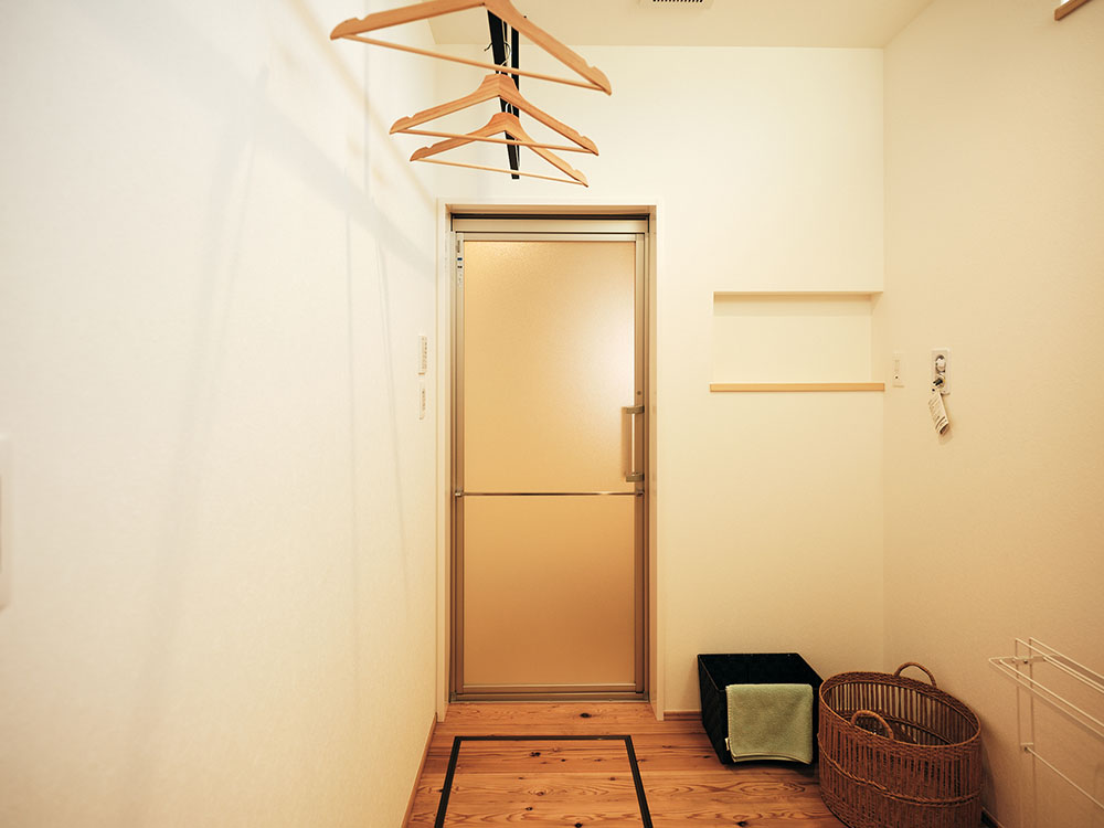 お風呂から脱衣室、洗面台、トイレまでが一直線に並ぶ、家事ラク動線を採用。近くにウォークインクローゼットもあるため、朝の身支度や洗濯後の収納にも便利です。