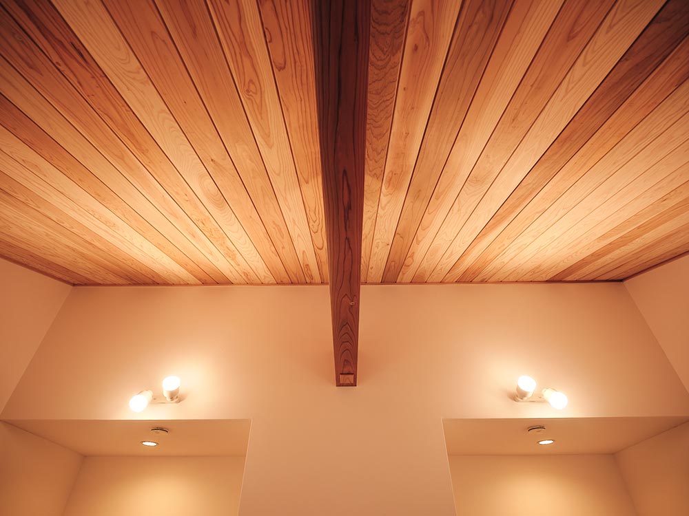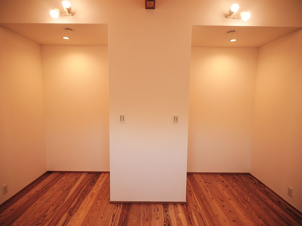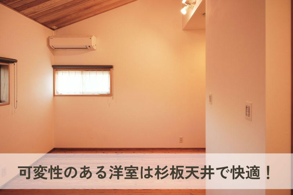 勾配天井と杉板を採用した洋室は、将来的に2部屋に仕切ることも可能です。