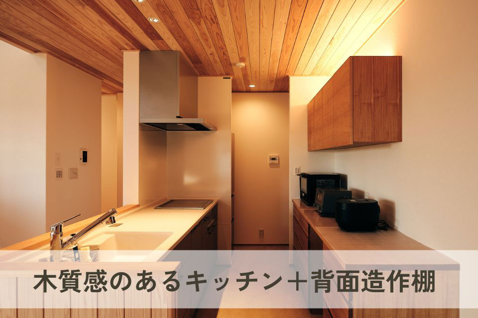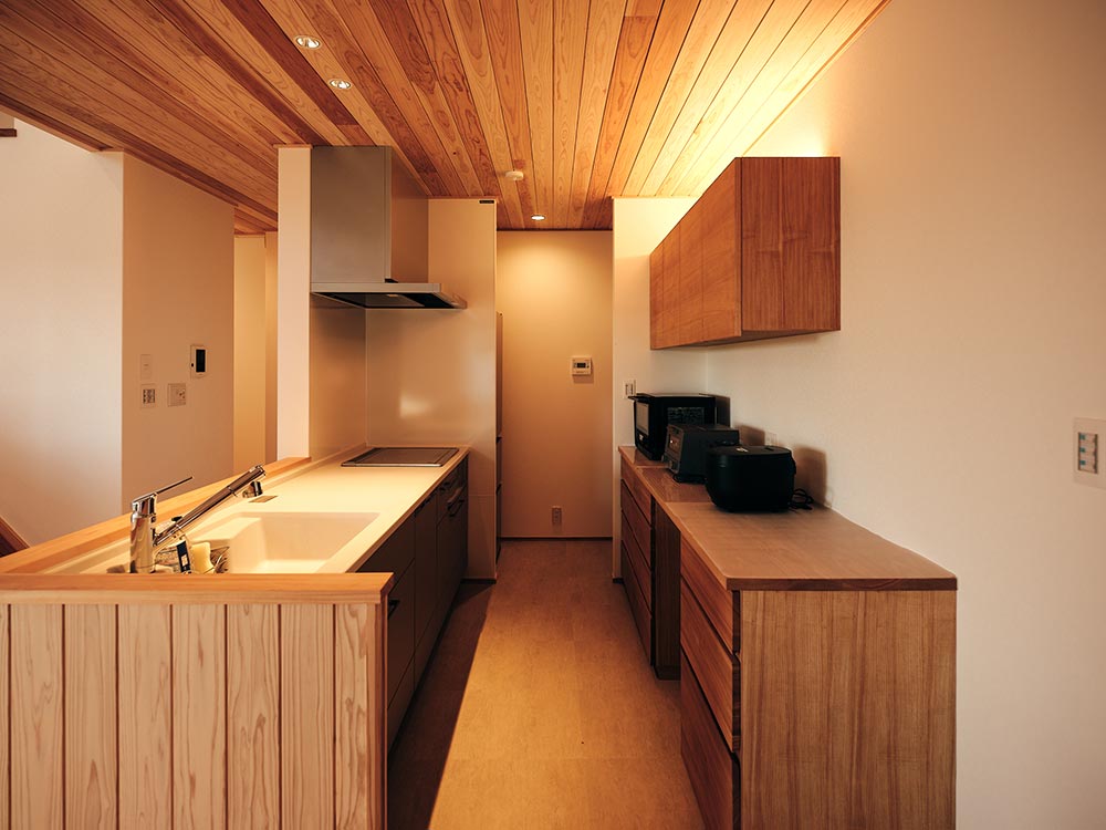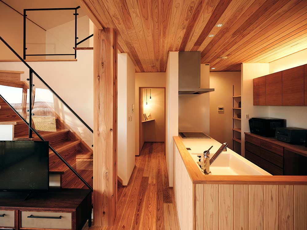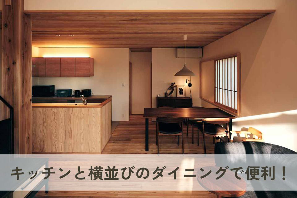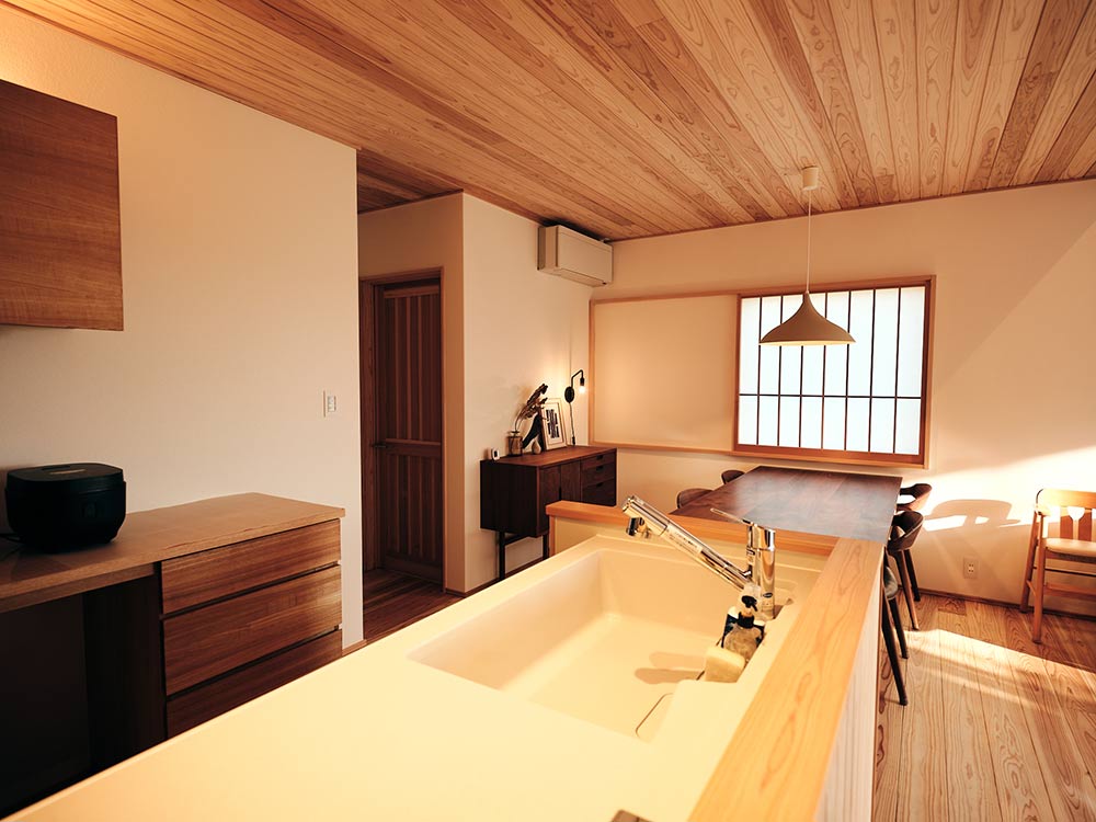 キッチンと横につながるダイニングは、食事の配膳や片付けがしやすい動線です。天井には杉板を使用し、温かみのある雰囲気を演出しています。