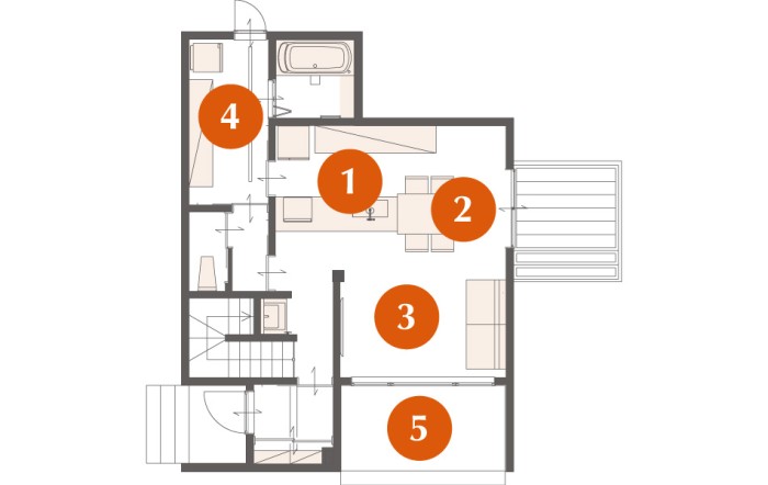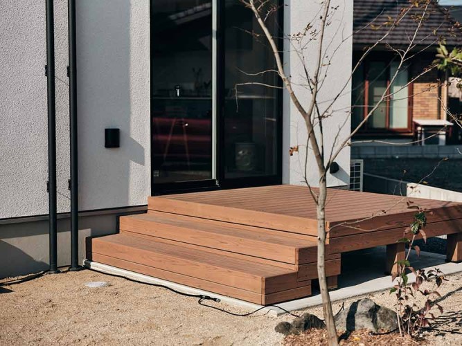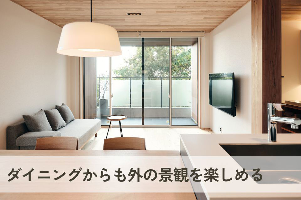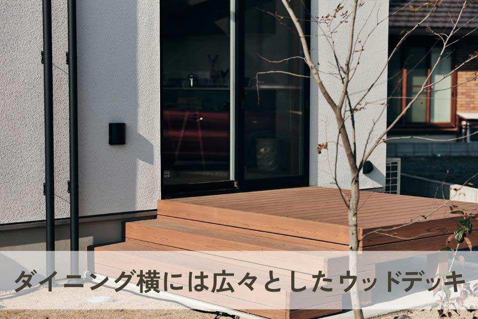 キッチンと横並びのレイアウトのため、配膳や片付けの動線がスムーズです。さらに、ダイニング横にはウッドデッキがあり、天気の良い日は外で食事を楽しむことも可能です。