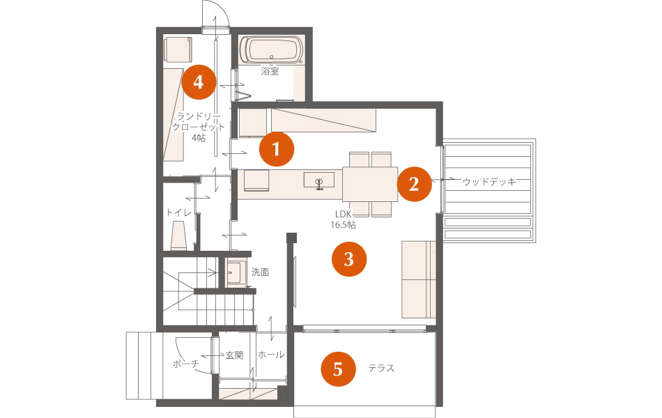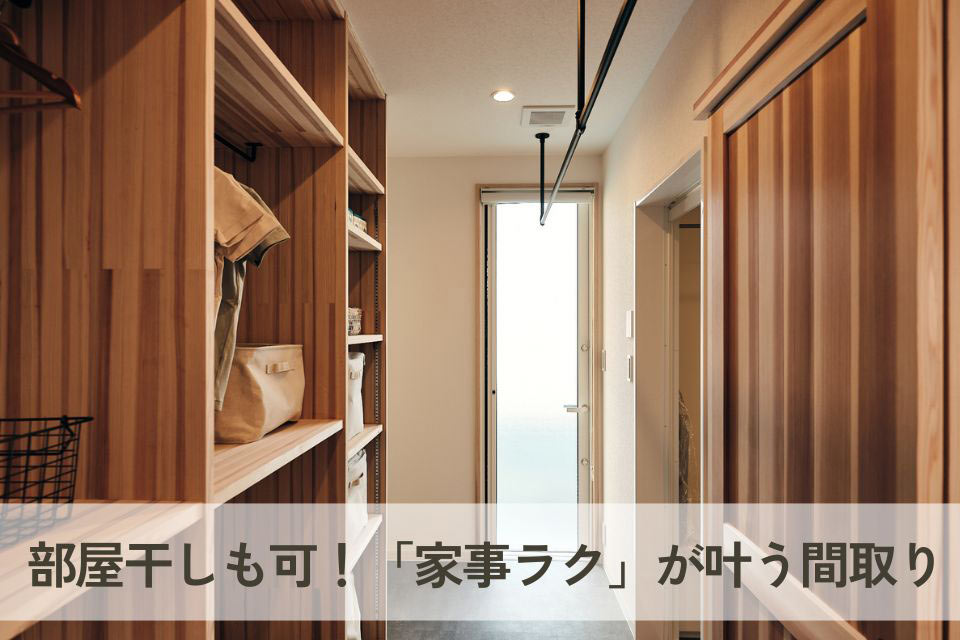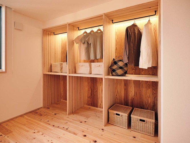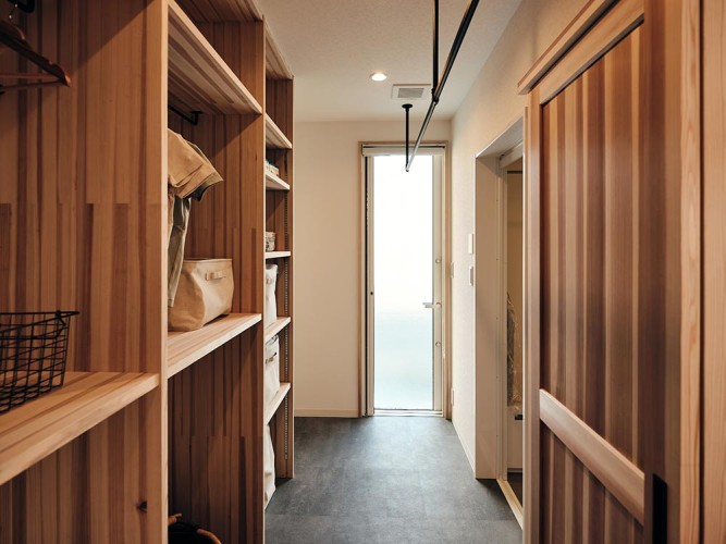 脱衣室にクローゼットの機能を設けたことで、「洗う、干す、収納する」が1箇所で完結。キッチンからも近く、家事のしやすい動線です。