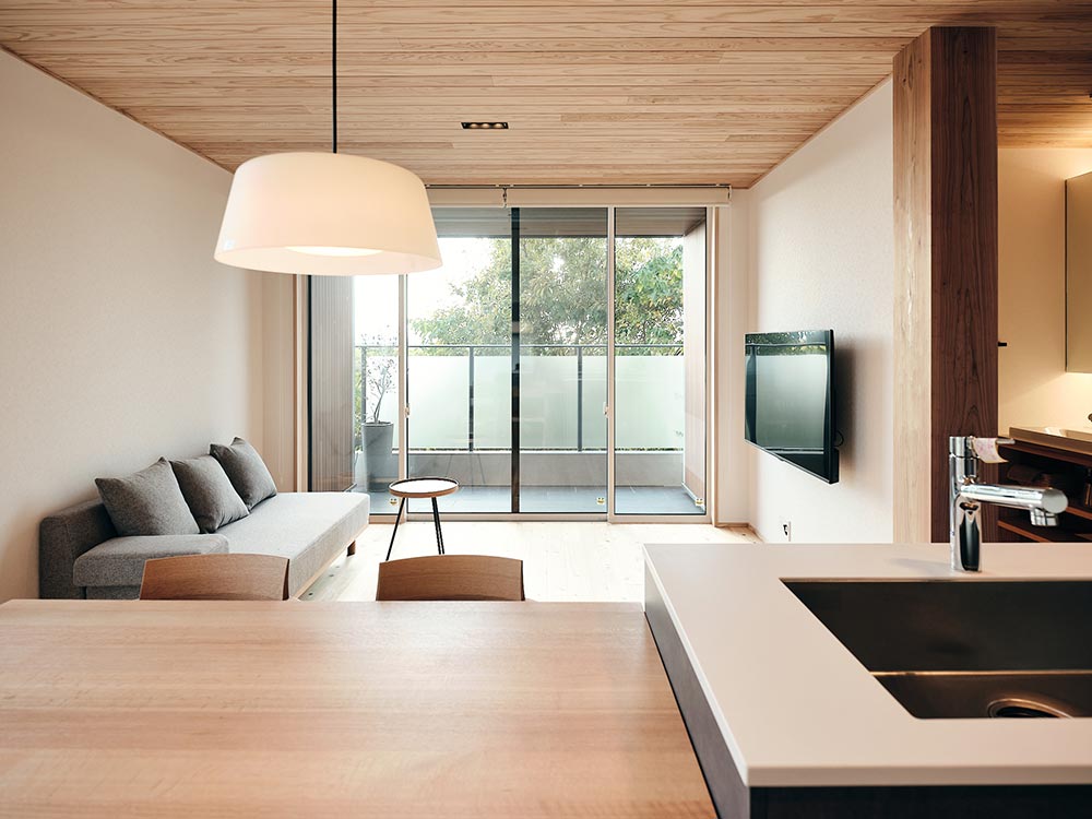 足を踏み入れた瞬間から木の香りに包まれるLDKは、大きな窓の外に広がる風景を借景として取り込み、四季折々の移ろいを日々の暮らしの中で感じさせてくれます。