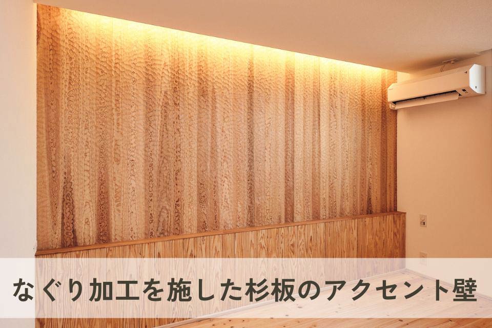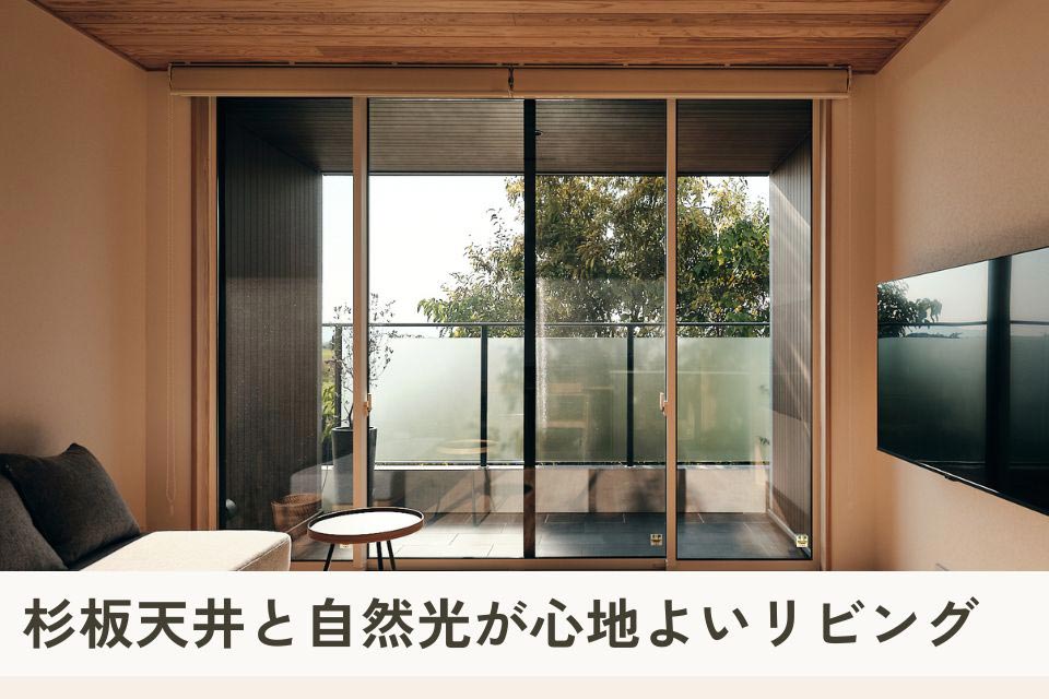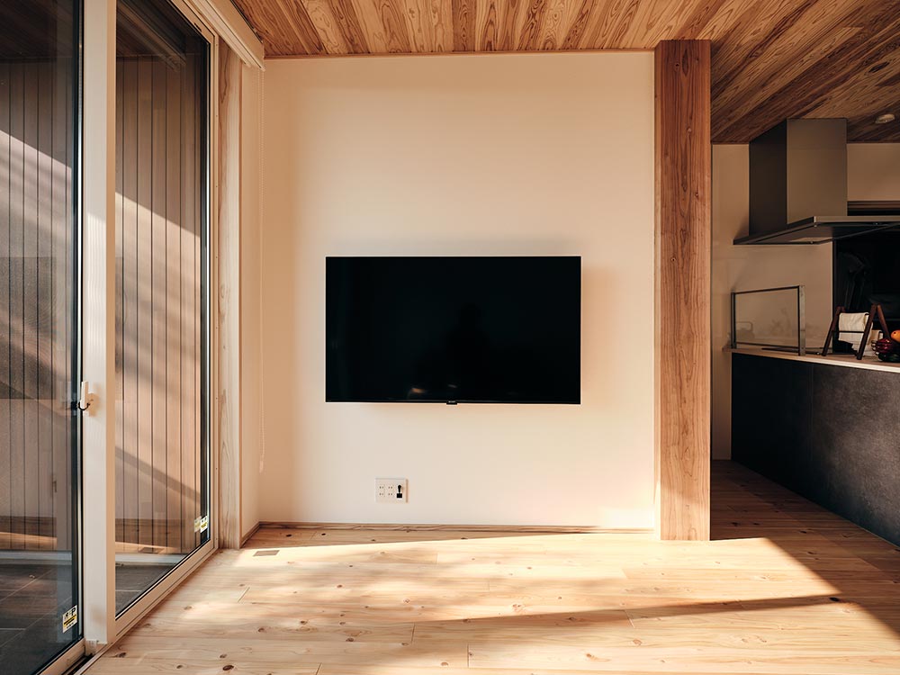天井には、節が少ない杉板を採用。自然素材ならではの温かみが感じられ、リラックスして過ごせる空間に仕上がっています。大きな窓からはたっぷりと自然光が差し込む、家族団らんの場所となる心地よいリビングです。