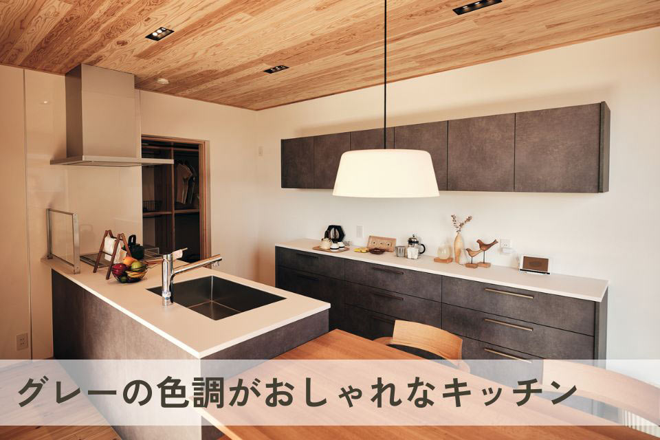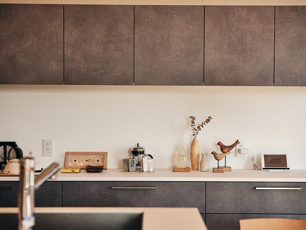 ステンレス製のペニンシュラキッチンを採用しました。濃いグレーを基調としたデザインは、落ち着いたシックな雰囲気を演出します。また、フラットタイプの天板でスッキリとしており、開放感のある空間になりました。