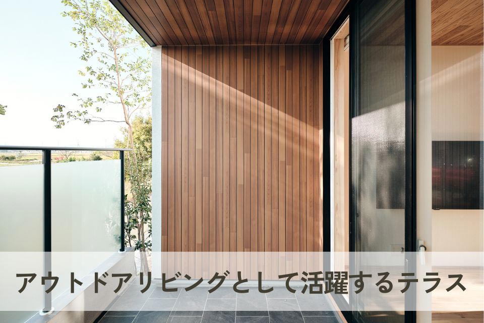リビングからつながる屋根付きのテラスは、セカンドリビングのような空間。椅子やテーブルを置いてアウトドアダイニングとして楽しんだり、趣味や読書の時間をゆったりと過ごしたりすることができます。