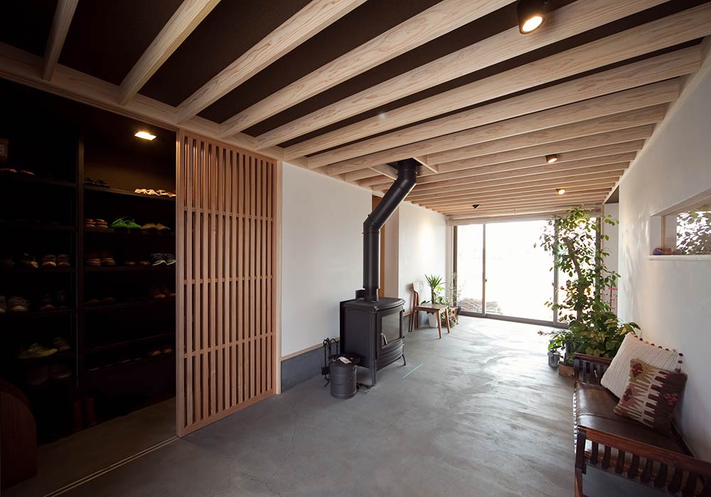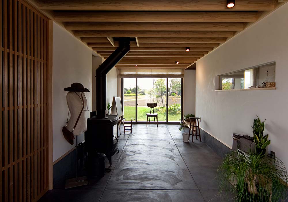 玄関から南側の庭までを見通す「通り土間」の空間は、好きな植物やアンティークチェア、季節のインテリアを置いたり、冬には薪ストーブを家族で囲んで楽しむ暮らしを実現。