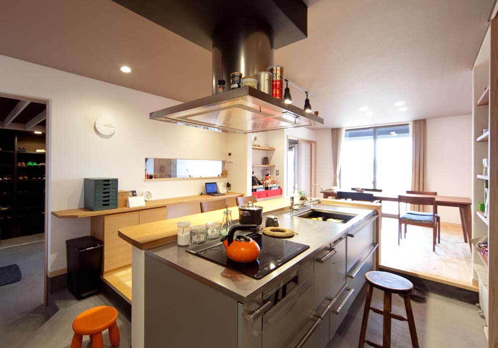 - カウンターに座る家族と目線が合う、土間続きのキッチン