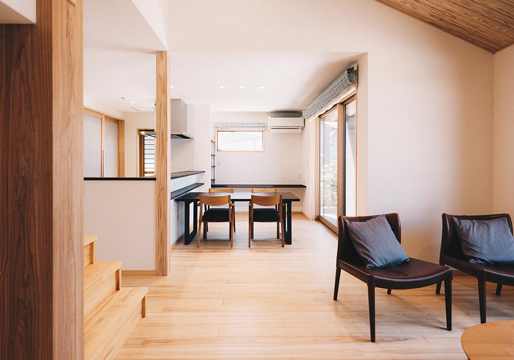 杉板天井で温かみのあるリビングは、心地よい家族団らんの空間です。
