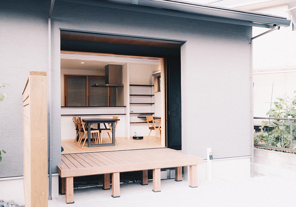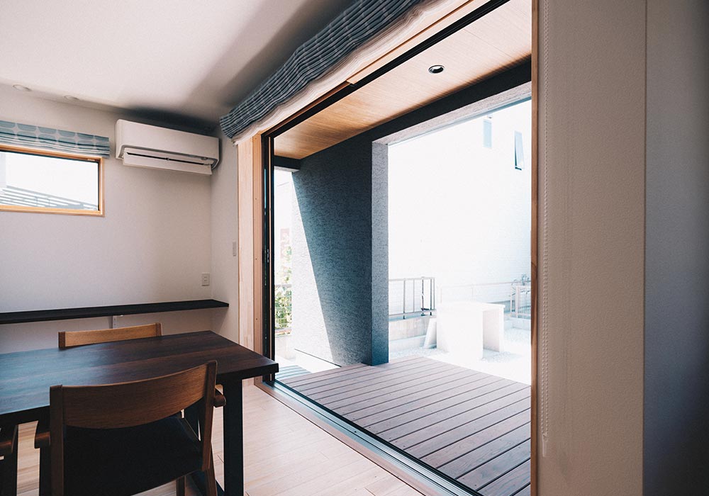大開口のサッシをフルオープンにすれば、ウッドデッキとつながる開放的なダイニング