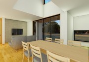 屋根を深くかけて雨の日にも中まで降りこまないデッキは、天井にも木質感を出しました。