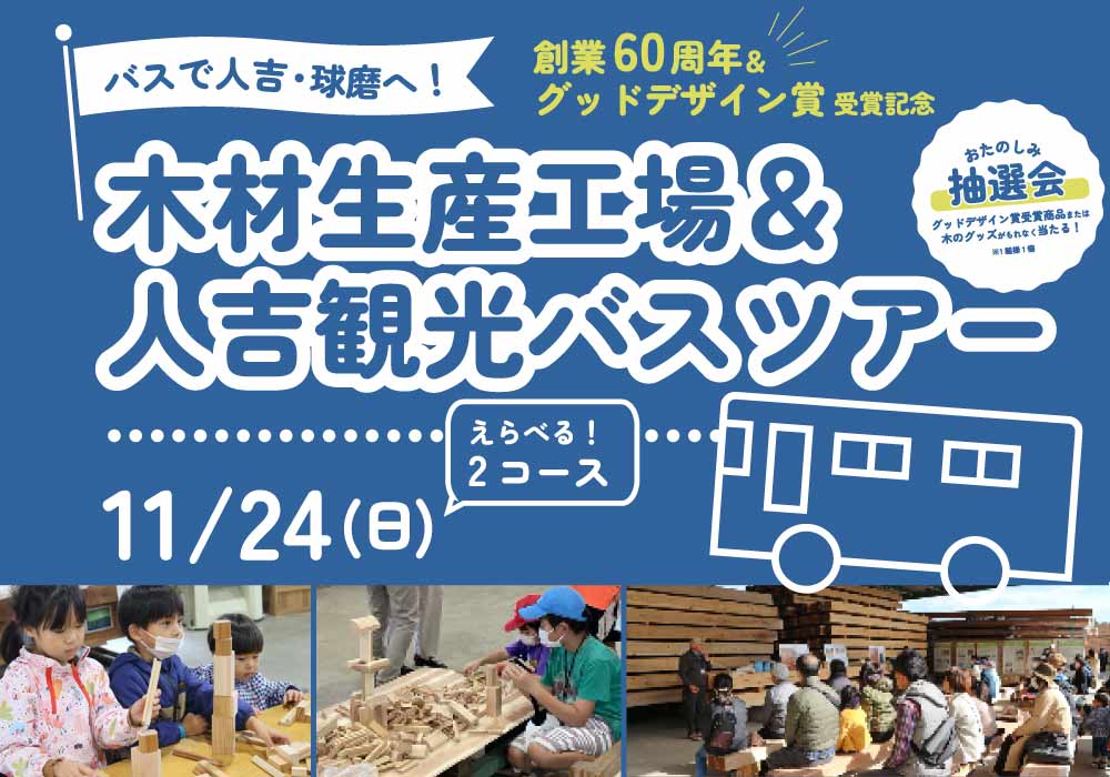【創業60周年&グッドデザイン賞受賞記念】バスで人吉・球磨へ!木材生産工場&選べる見学ツアー