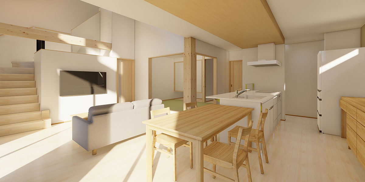 さらに、キッチンとダイニングの天井をあえて低く抑え、リビングには吹き抜けを設けることで、空間にメリハリが生まれました。