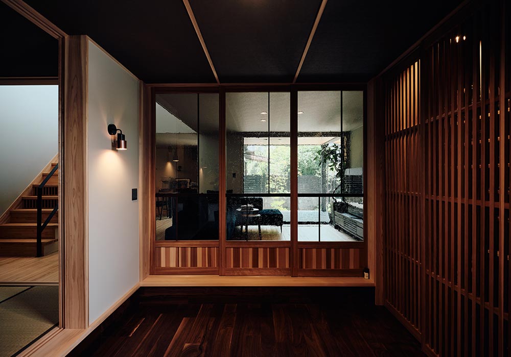 玄関ホールを設けずに、木土間から直接リビングや和室へ。