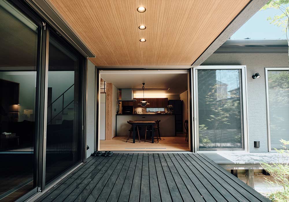ダイニングと隣り合うウッドデッキは、屋根付きの空間。