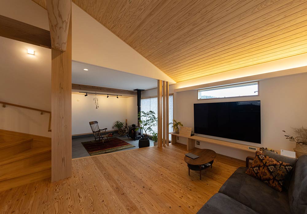 9帖の土間続きのLDKはナナメの勾配天井で、開放感と木質感たっぷりの空間です。