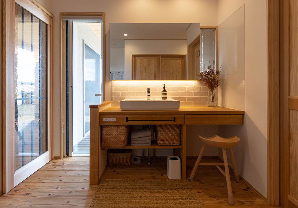 また、存在感のある大黒柱や梁、床には木材の表面をこすって仕上げる「浮造り仕上げ(うづくりしあげ)」を採用。