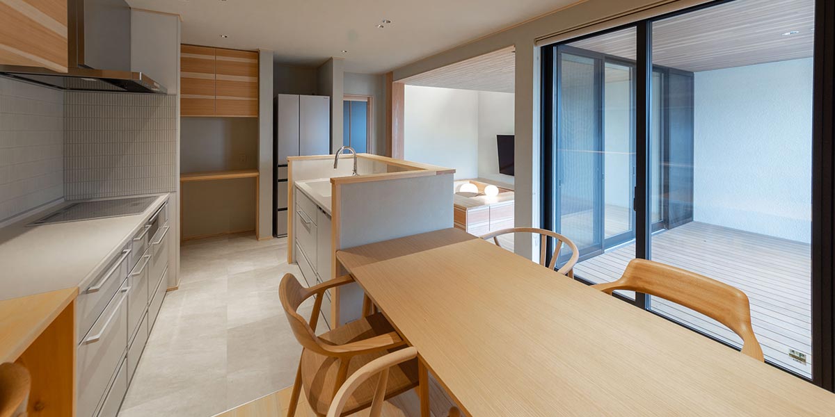 屋根が深くかかったウッドデッキは、食事をしたり、のんびり過ごしたりと、四季を楽しみながら過ごすことができるセカンドリビングにもなります。