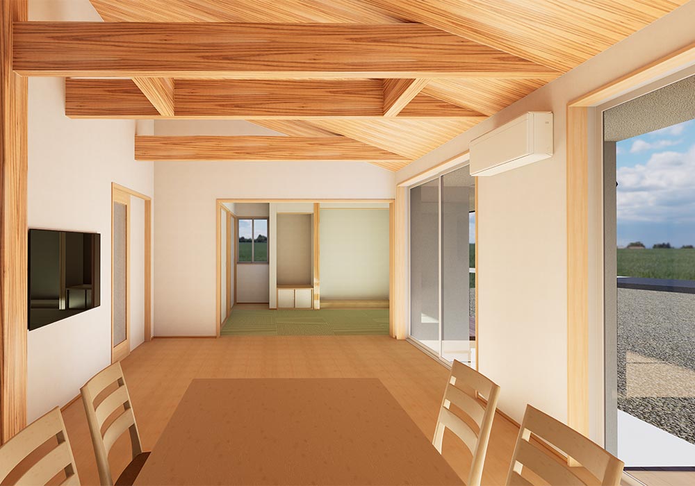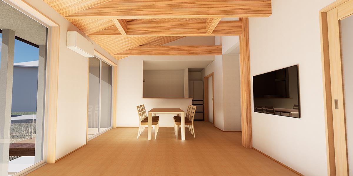 杉板張りの天井と化粧梁を採用したLDKには、ふわりと木の香りが広がります。