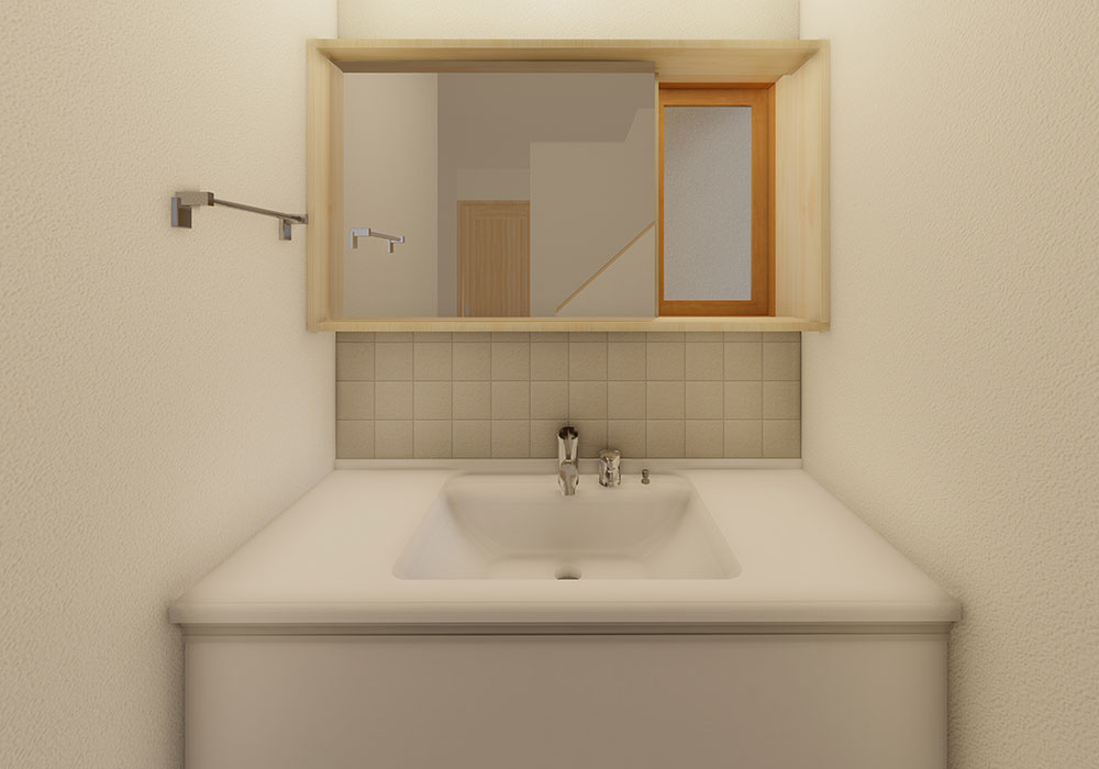 - ベージュのタイルを採用し、可愛らしいデザインに仕上がった洗面台