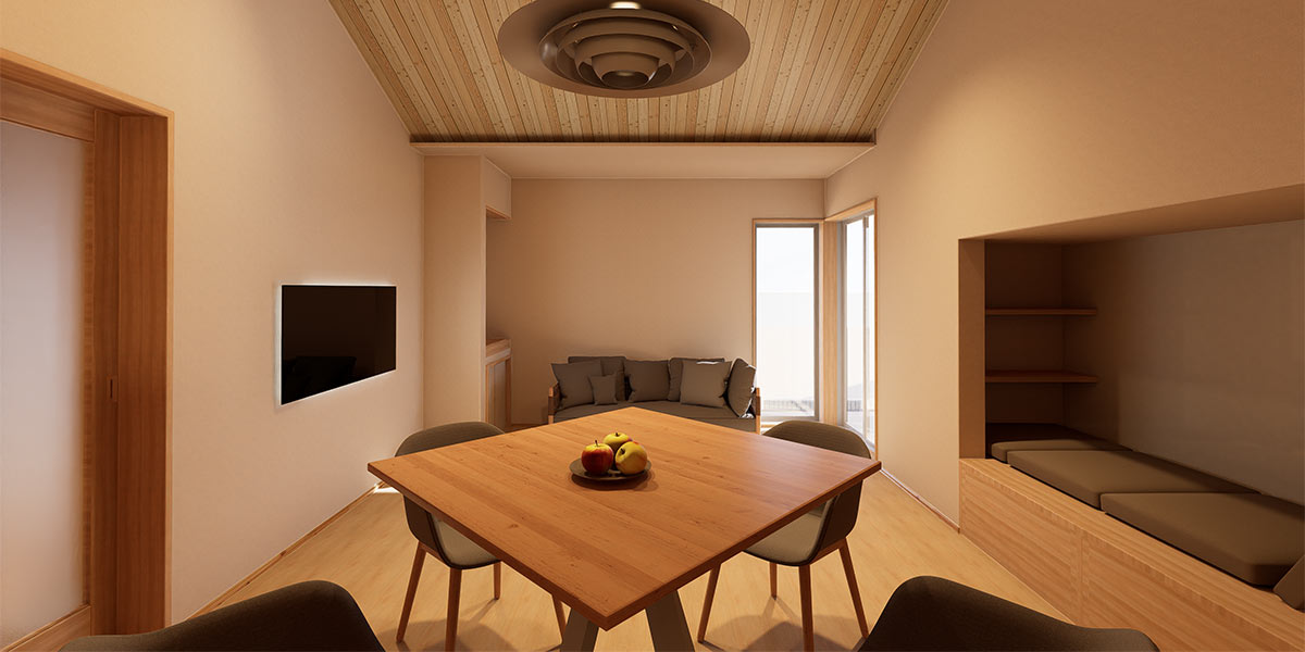 LDKには桧の床材と杉の天井材を採用し、どちらも節の少ないものを用いているため、すっきりとしつつ木のぬくもりがたっぷり感じられる印象です。
