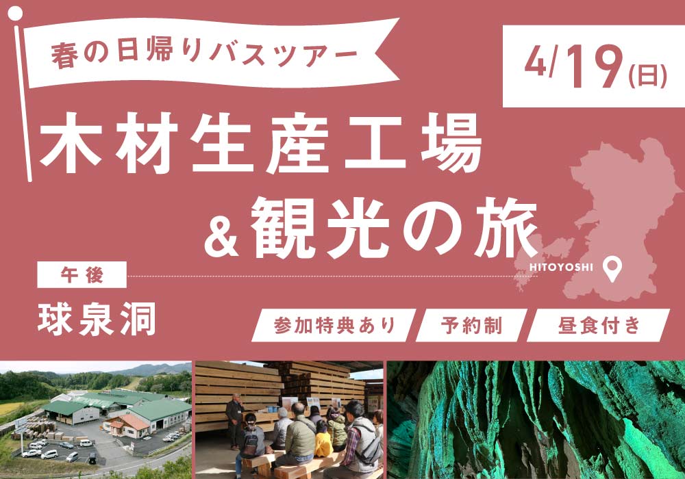 - AM:多良木プレカット協同組合ストックヤード(球磨郡多良木町)/PM:球泉洞(球磨郡球磨村)