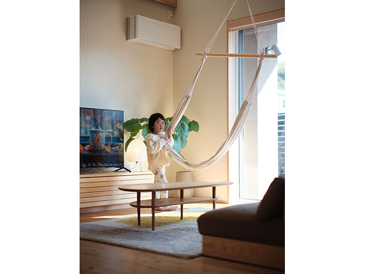“ナナメ”の勾配天井のリビングは、柔らかな自然の光が差し込む開放感抜群の心地よい空間。
