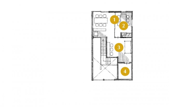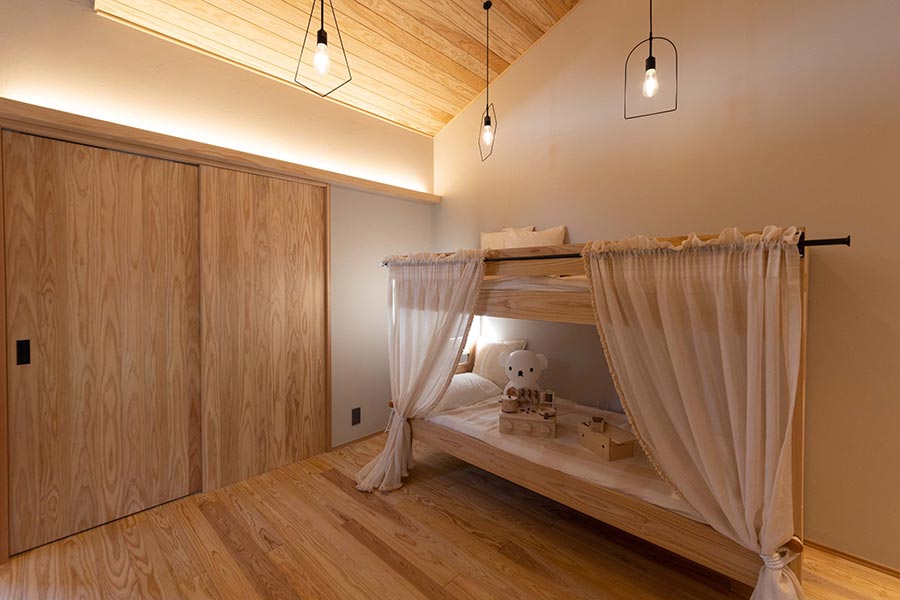 杉板を張った斜めの天井で、木の温もりと広がり感を。