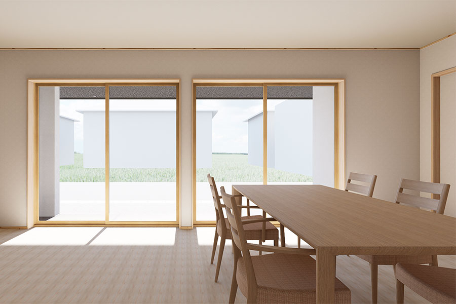 ダイニングからは、大きな窓越しに外の景色を眺めながらお食事を楽しめます。朝はやわらかな陽ざしを感じながら、夜は庭の灯りを眺めながらと、1日の時間の流れを心地よく感じられるスペースです。