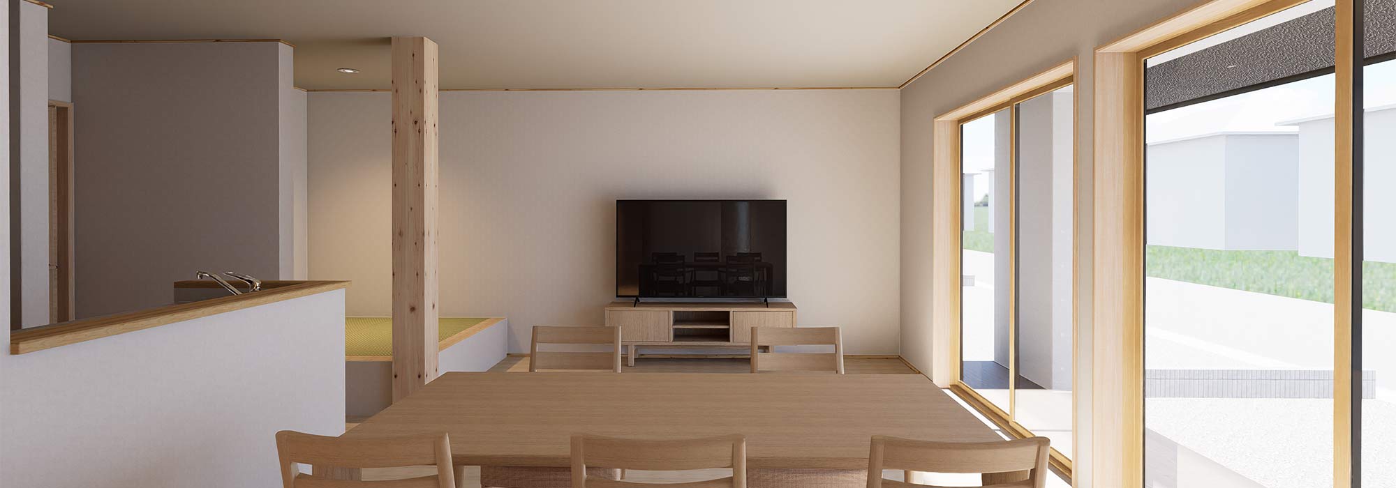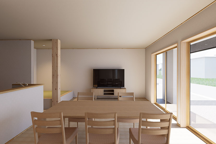 キッチンから直接配膳ができる配置で、家事の負担を軽減したリビングです。家族が自然と集まりくつろげる広さと、ダイニング・畳コーナーとの一体感を大切にした空間になっています。